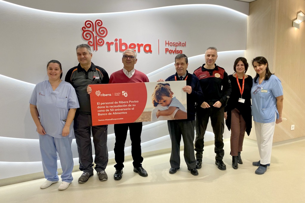 O persoal do Hospital Ribera Povisa doou 6100 quilos de produtos de primeira necesidade ao Banco de Alimentos de Vigo, grazas ao donativo achegado na cea do 50 aniversario do hospital, que se celebrou o pasado 21 de decembro. En representación dos traballadores do hospital, Lorena Vilán, Manuel Domínguez, Miguel Ferradás, Julio César Verde, Mara Parente e Remedios Campos entregaron o donativo equivalente a 6.100 quilos de alimentos a Iván Martínez, Presidente do Banco de Alimentos de Vigo nun acto organizado no centro.