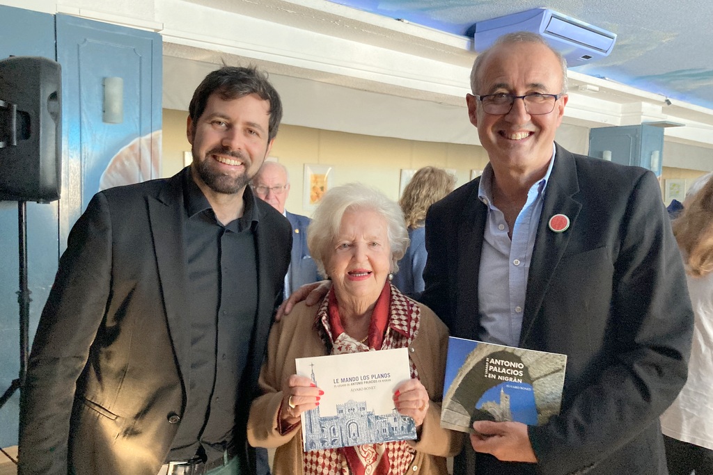 “Tenemos la suerte de contar en Nigrán con una de las obras más hermosas de la arquitectura del siglo XX en Galicia y, sin duda, la obra religiosa más representativa de Palacios, el Templo Votivo, por eso estamos aquí, para divulgarlo e invitar a los madrileños a conocerlo”, señaló González. “Palacios puede ser un elemento más de dinamización de Nigrán porque fuera de Galicia no es tan conocido el Templo Votivo, siendo una obra maestra en muchos sentidos y que necesita ser rehabilitada”, añadió Bonet, quien describió a un Palacios minucioso, “capaz de hacer maravillosas obras grandilocuentes como este Templo pero también recogidas como el chalé del Sileno en Playa América”. Asimismo, destacó su empeño en preservar el arco visigótico de la antigua iglesia de Panxón al punto de regalar su proyecto del Templo a cambio de que se conservara ese arco. Bonet da testigo también en el libro del interés de Palacios en el Románico con unos dibujos de su autoría sobre la iglesia de Santiago de Parada que titula “Estudio Arqueológico”.