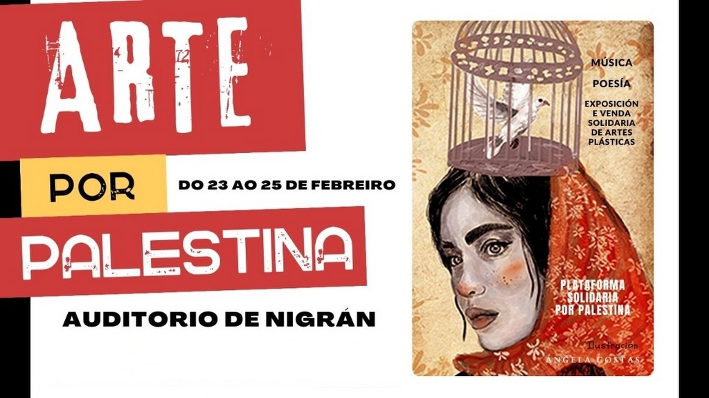 O Auditorio Municipal de Nigrán acollerá do 23 ao 25 de febreiro a exposición “Arte por Palestina”. A mostra conta coa participación de máis de 40 artistas plásticos e colaboración de preto doutros tantos artistas, músicos e poetas, algunhas e algúns afeccionados, outras profesionais e mesmo artistas de recoñecido renome como R. Úbeda, J.M. Barreiro, Caino, M. Lence, X. Costa, P. del Palacio, Y. Herranz, J. Pastor, A. Cerviño, E. Gómez-Dahlgren e moitos outros.