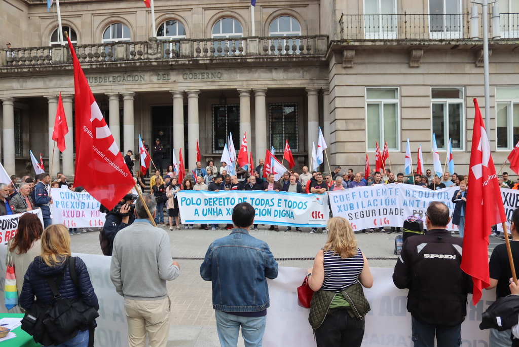 Delegadas e delegados da CIG de diversos sectores e actividades laborais concentráronse na mañá deste xoves diante da Delegación do Goberno na Coruña e nas Subdelegacións de Pontevedra, Ourense e Lugo “polo dereito de todas e de todos a unha xubilación digna”. As mobilizacións prodúcense cando se está a negociar de xeito opaco unha nova reforma sobre xubilación parcial e a implantación de coeficientes redutores que ameaza con introducir novos recortes no sistema público de pensións.