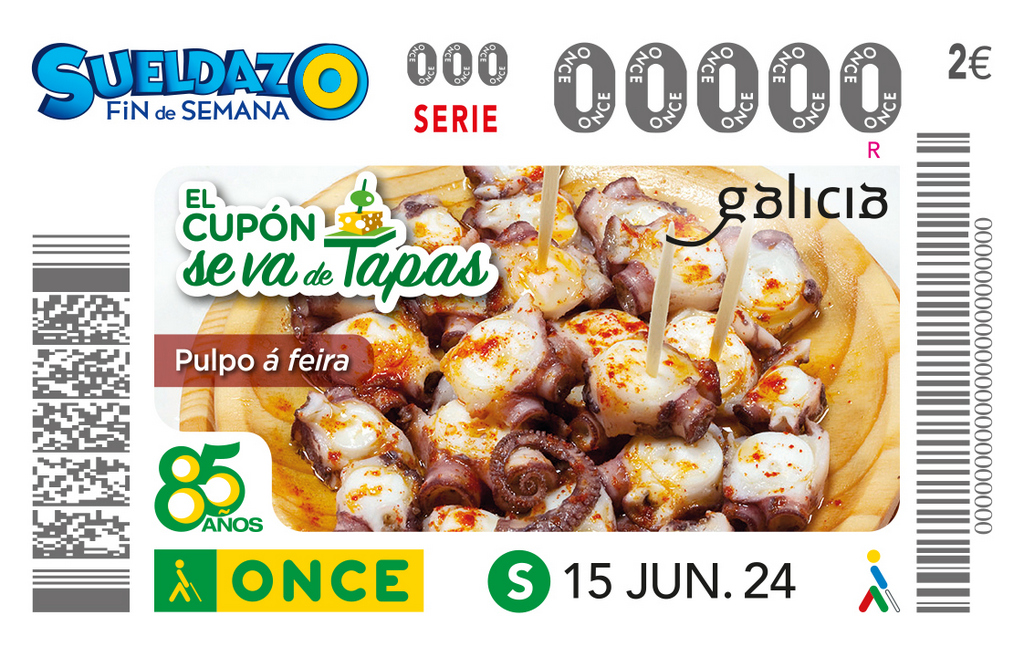 O Polbo á Feira é o protagonista do cupón da ONCE do sábado, 15 de xuño, pertencente á serie “O cupón vaise de tapas”. Cinco millóns de cupóns levarán por toda España ese prato básico da gastronomía de Galicia.