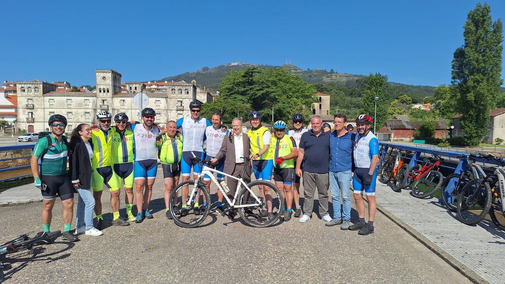 La pequeña comitiva fue recibida al lado del Miño por el alcalde, Roberto Carrero, y los concejales, Óscar Álvarez e Isidro Lomba. Allí, conversaron sobre las dificultades que habían tenido como muchos peregrinos: el pinchazo de una rueda.
