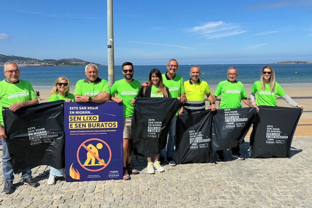El Ayuntamiento de Nigrán sumará al dispositivo de vigilancia sin precedentes durante el San Juan a un equipo concienciador a pie de Playa América-Panxón para disuadir de que se caven grandes agujeros. De este modo, desde el mediodía, una decena de voluntarios pertenecientes a Amigos da Terra recorrerán el arenal con sacos que entregarán a los grupos de asistentes al tiempo que les informan del daño que supone dejar basura o cavar agujeros (más allá de las multas económicas que están contempladas). El objetivo es que depositen en estos sacos todos los residuos que generen durante la noche y que, al finalizar, los dejen en los contenedores dispuestos en las entradas a la playa. “Este San Juan en Nigrán… Sin basura y sin agujeros” es el lema con el que está serigrafiada esta gran bolsa facilitada desde PreZero, la concesionaria del servicio de limpieza en el municipio.