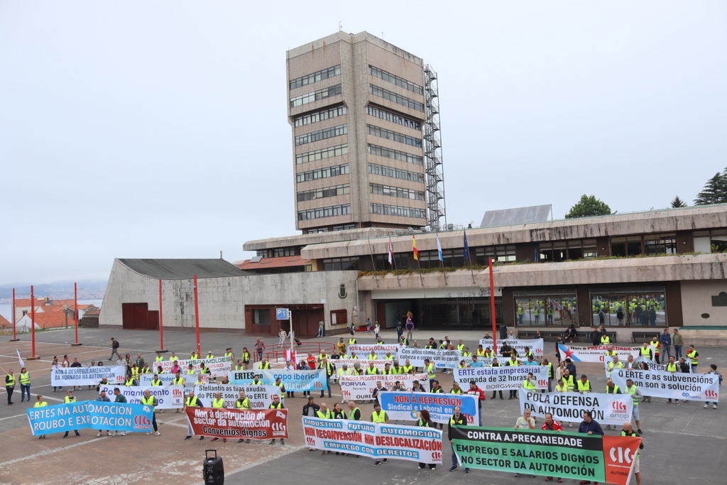 Deslocalización, explotación, precarización, reconversión. Estas son as principais ameazas que enfronta o sector galego do automóbil, e que a CIG escenificou hoxe diante do Concello de Vigo cunha concentración na que representantes da central sindical en máis de 20 empresas da industria da automoción despregaron faixas e expresaron as súas problemáticas concretas.