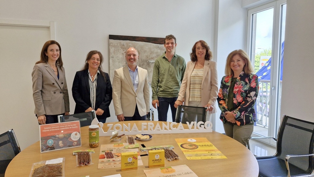 El Delegado del Estado en el Consorcio de la Zona Franca de Vigo, David Regades, recibió hoy en la sede de Areal a Keila Pousa y Edurne Sendra, socias de la empresa Calabizo después de obtener el Premio BBVA a los 10 Mejores Productores Sostenibles de España 2024 por su chorizo de calabaza 100 % vegetal.