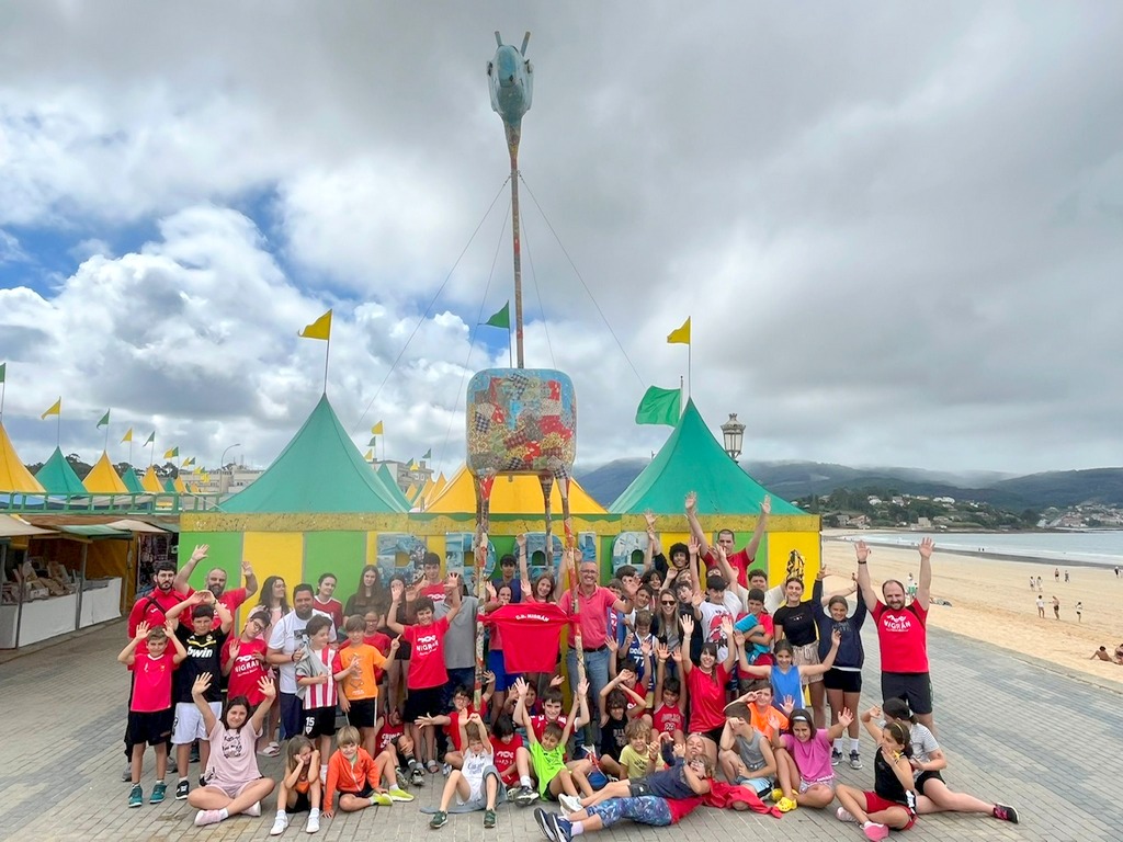 La impresionante “Carmiña”, que estará durante todo el verano en la entrada del mercado del paseo marítimo junto con un pulpo y un caballito de mar de la misma autoría, fue presentada por René y el alcalde, Juan González, a los niños del campus del Club Baloncesto Nigrán (entidad deportiva con sede en el Pabellón Municipal). Lo cierto es que la envergadura de la mascota, junto con detalles como sus zapatillas deportivas gigantes, su colorido o las pestañas a base de cepillos reciclados llaman la atención de todas las personas que se acercan hasta Playa América.