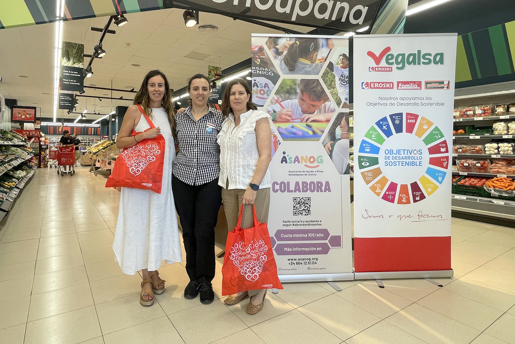 “Desde Vegalsa-Eroski queremos seguir contribuyendo de manera activa al apoyo de los niños y niñas que padecen esta enfermedad en nuestra Comunidad y queremos hacerlo de mano de ASANOG para continuar dando luz a sus proyectos tan necesarios para estas familias. Por ello, animamos a nuestros clientes a adquirir estas bolsas solidarias con las que, además de emplear un artículo sostenible para poder llevar sus compras, también colaboran con una buena causa”, señaló Gabriela González. Por su parte, Yenny Rodríguez, de ASANOG, indicó que “las bolsas solidarias no solo recaudarán fondos vitales para nuestra asociación, sino que también ayudará a crear conciencia sobre la importancia de apoyar a las familias que están viviendo el cáncer infantil en Galicia. En ASANOG queremos agradecer a Vegalsa-Eroski por hacer de cada bolsa una compra especial, que contribuye a mejorar la vida de la infancia y adolescencia oncológica”.