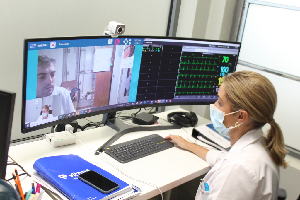 El tercer elemento es el centro de referencia emplazado físicamente en el Servicio de Urgencias del Hospital Vithas Vigo, y que consiste en una doble pantalla de gran formato. Una en la que se puede ver tanto al paciente y su entorno, como las imágenes de las cámaras del dispositivo portátil; y una segunda en la que se registran todos los datos de las pruebas diagnósticas realizadas.