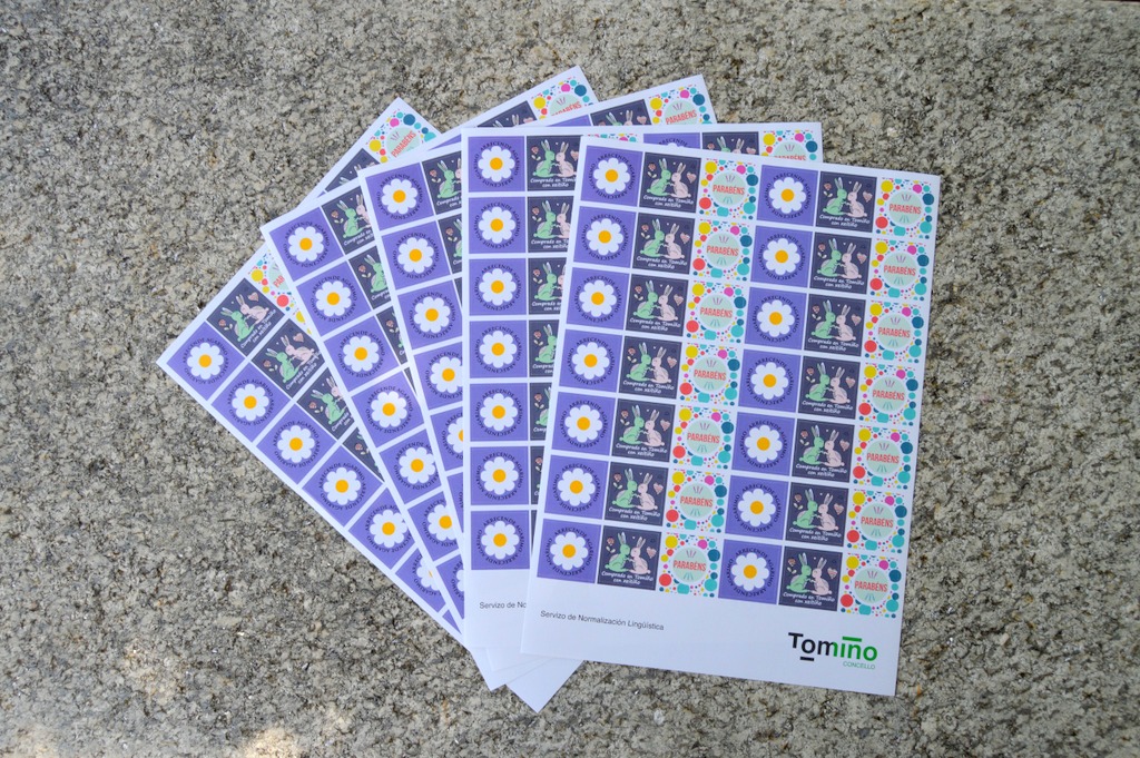En esta ocasión, se realizó un reparto por los diferentes comercios locales de pegatinas llenas de color y con bonitos mensajes para agasajar como “Arrecende Agarimo”, “Parabéns” o “Mercando en Tomiño con xeitiño”.