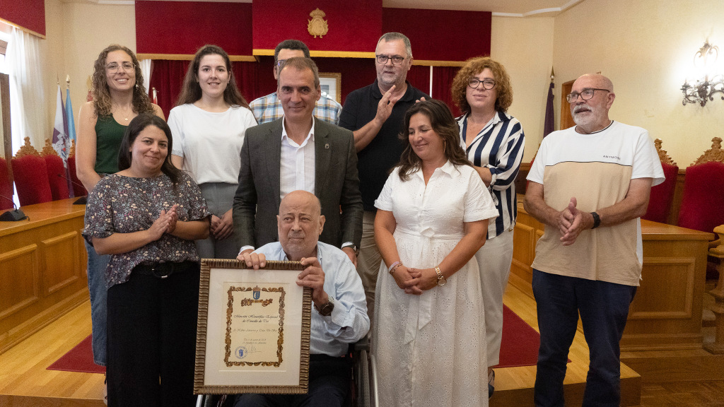 Xabier Añoveros Trías de Bes recibió este mediodía de manos del alcalde, Enrique Cabaleiro, y de la teniente alcalde, Ana Núñez, la “Mención Honorífica Especial” del Ayuntamiento de Tui. Con este reconocimiento la institución municipal quiso reconocer su estrecha relación con la ciudad desde hace décadas, y a la que ha dedicado un amplio conjunto de trabajos de investigación. El acto celebrado en la casa del ayuntamiento contó con la presencia de miembros de la corporación municipal, de autoridades civiles y militares, de familiares y amigos del homenajeado que llenaron el salón de plenos.