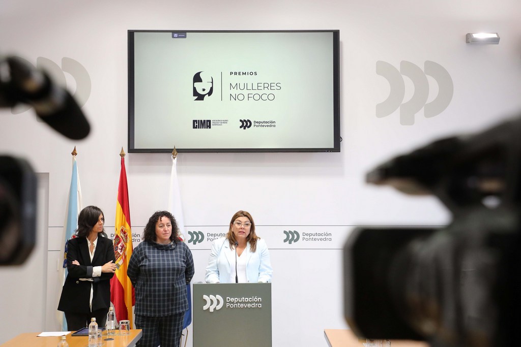 La diputada de Igualdad Sandra Bastos, junto con Nati Juncal, delegada de CIMA en Galicia, y Elena García Román, delegada adjunta, presentó la nueva edición de los premios Mulleres no Foco, promovidos por la Diputación de Pontevedra en colaboración con la Asociación de Mulleres Cineastas e de Medios Audiovisuais (CIMA). Se trata de unos galardones que tienen por objetivo, tal y como explicó la diputada de Igualdad, “incentivar, apoyar y reconocer la trayectoria y papel de las profesionales gallegas del audiovisual y hacer que lleguen al conjunto de la sociedad”.