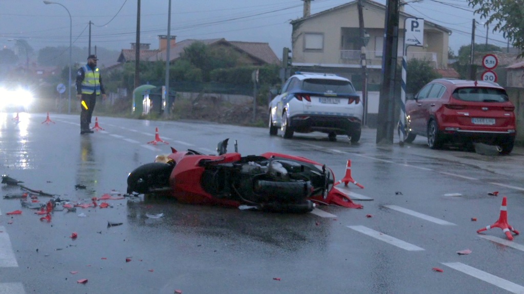 FOTO: TVG // Un motorista pierde la vida en una colisión contra un turismo en Nigrán. Ocurrió en la recta de Camos, en la EP-2102, y el conductor del coche fue evacuado al hospital en ambulancia.