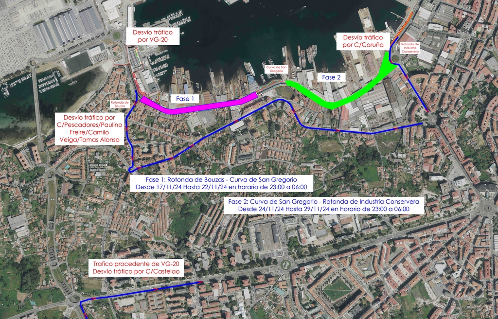 Los trabajos se desarrollarán en diferentes fases. La primera de ellas afectará a la zona comprendida entre la curva de San Gregorio y la rotonda de Bouzas (a la altura del Mercado). Está previsto que esta primera fase se inicie la noche del domingo 17 de noviembre a las 23h. y concluya en la madrugada del viernes 22 de noviembre a las 6h.
