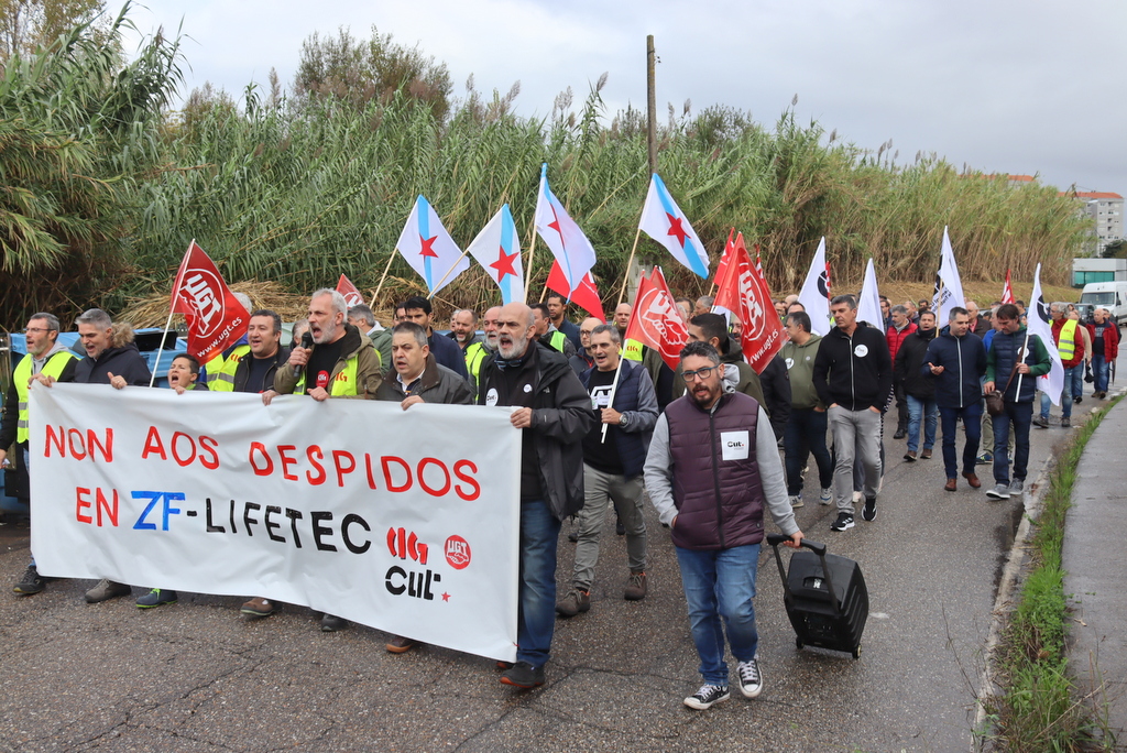 La mayoría del comité de empresa de ZF Lifetec España (antigua Dalphimetal) calificó de “éxito rotundo” la jornada de huelga convocada hoy para rechazar el despido de tres trabajadores. Coincidiendo con el paro alrededor de 300 personas recorrieron en manifestación el polígono vigués del Caramuxo, haciendo paradas en los dos centros de trabajo de la empresa del sector de la automoción para reclamar la readmisión de los despedidos.
