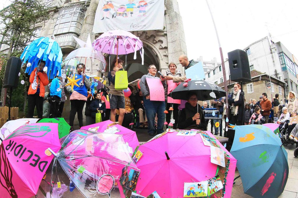 La jornada comenzó con una andaina por el centro de la villa a la que se sumaron cientos de escolares del municipio, así como usuarios y usuarias del centro de día y de AFAGA. Ya en la Praza do Concello se celebró el tradicional concurso de paraguas. Cada uno de los centros participantes decoraron un paraguas reivindicativo y fue un jurado de Aceesca quien otorgó los premios. De esta vez, el ganador fue el del colegio Hermanos Quiroga, seguido del de Aceesca y del colegio Antonio Palacios.