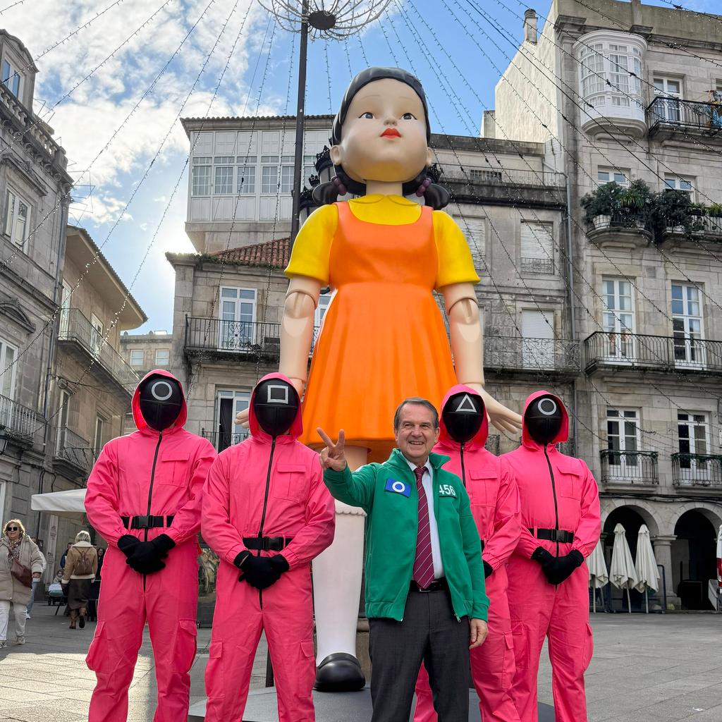 Netflix escoge Vigo para promocionar “El Juego del Calamar 2”. La serie surcoreana es la más vista de la historia de la plataforma con más de 265 millones de reproducciones con su primera entrega, convirtiéndose en un fenómeno cultural a nivel mundial. Esta mañana, el regidor vigués, Abel Caballero, se enfundó la chaqueta del jugador 456 (Seong Gi-hun) para recibir en la ciudad la figura de la muñeca Young-Hee, que llega acompañada de los pink guards. Con un tamaño de 4,5 metros, estará instalada en la Plaza de la Constitución desde el viernes 13 hasta el domingo 15 de diciembre, para que los vigueses puedan jugar a “Luz verde, luz roja”. Vigo es la primera ciudad escogida por Netflix para realizar la promoción de la segunda temporada del serial, que se estrenará el próximo 26 de diciembre.