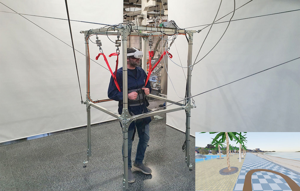 Se trata de un entorno de rehabilitación robótica equipada con realidad virtual de la que podrán beneficiarse pacientes con distintos grados de necesidades terapéuticas. En este nuevo sistema los pacientes son sostenidos y movidos por un robot de cables (Cable Driven Parallel Robot o CDPR), en el que son los propios impulsos de la persona paciente los que generan la intención de movimiento, que luego es utilizada por el robot para seguirlo y apoyarlo. Al mismo tiempo, al estar dotado de ese sistema de realidad virtual, el paciente podrá experimentar el movimiento de forma inmersiva en diferentes escenas, gracias al uso de gafas virtuales, lo que hace más llevaderas las sesiones de rehabilitación. Todo esto bajo continua supervisión médica, desde donde se podrán cambiar las fuerzas, impulsos y escenarios virtuales del robot.