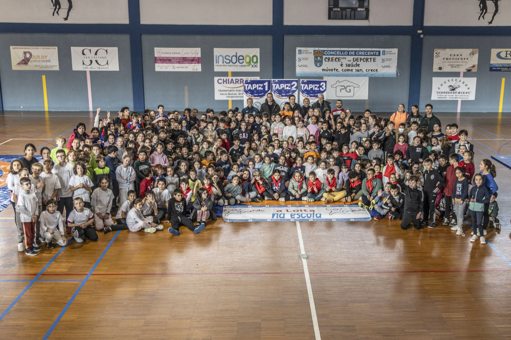 El Concello de Crecente acogió este miércoles en horario lectivo el Xogaloita: xogando ás loitas olímpicas. Más de 300 niños y niñas de primaria participaron en esta actividad lúdico-formativa, en la que los centros educativos a través de diferentes juegos relacionados con las Luchas Olímpicas, compiten entre sí.