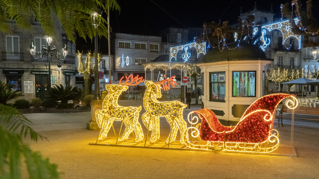 Tres ángeles se yerguen en el palco de la música de la Corredoira, y en la Praza da Inmaculada se sitúa un año más un belén lleno de luz, y el trineo de Papá Noel y los renos, con un deseo de Buenas Fiestas desde el balcón del edificio que alberga el Taller Mágico de Papá Noel. Completa esta hermosa estampa las letras iluminadas de “Tui.2025”. La iluminación llena de color la ciudad al igual que lo hacen los veinte puestos del Mercado de Nadal en el Paseo da Corredoira.