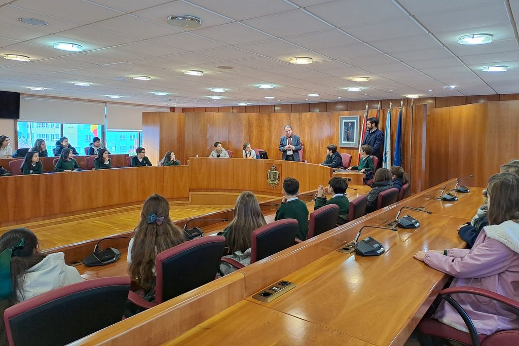 El alcalde recibió este martes, en el Salón de Plenos, a 50 escolares del CPR Miralba Jesuitinas que participan en el programa didáctico “Visita o teu Concello” con el que reciben información del funcionamiento de la administración municipal. Abel Caballero les explicó la incidencia del trabajo que se desarrolla en el Concello en un gran número de servicios que recibe la ciudadanía, desde el abastecimiento del agua a la limpieza de las calles. A lo largo del presente curso escolar 2.500 estudiantes participan en la iniciativa formativa sobre el trabajo municipal.
