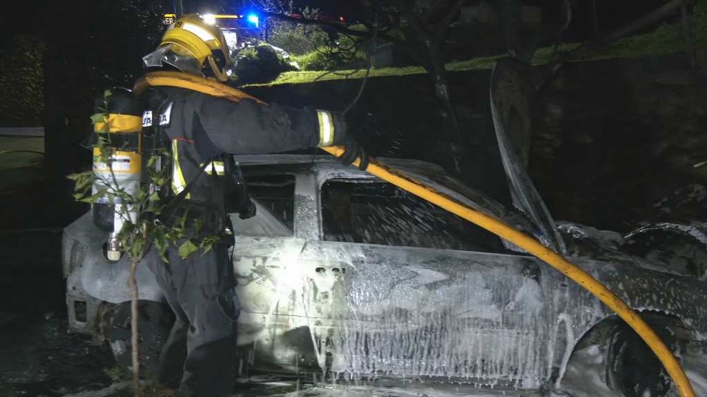 FOTO: TVG // Dos vehículos ardieron esta noche en el jardín de una vivienda en Pedornes, en el ayuntamiento de Oia. La alerta saltó a las 21:00 horas, cuando el dueño intentó apagar el incendio con mangueras, pero las llamas eran muy virulentas y se extendieron con rapidez.