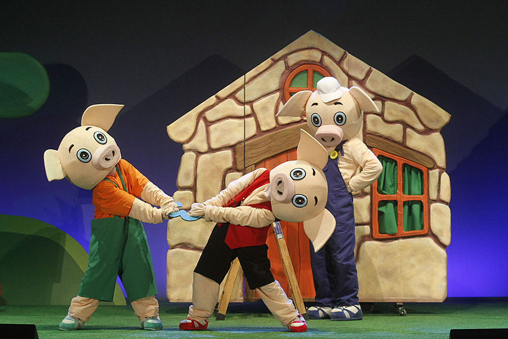 Se trata de una obra musical con muñecos a tamaño real. Una revisión de la tradicional fábula para adaptarla a los nuevos tiempos, incluyendo las figuras de Xan y Xiana, dos exploradores muy aficionados a los cuentos, que se adentran en el bosque para conocer a sus personajes favoritos. En su viaje, además de descubrir la historia, los tres cerditos bailarán al ritmo de las cinco canciones -cantadas en directo- que componen el espectáculo, y que tienen una clara misión didáctica para que los más pequeños aprendan o refuercen conocimientos como los números, los colores o las prendas de vestir.