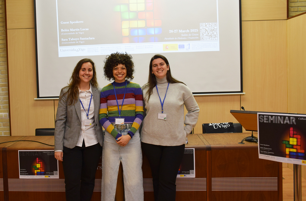 La actividad, que se celebra en Vigo por tercer año consecutivo, está dirigida al estudiantado de grado, máster y doctorado que desea compartir su trabajo de investigación sobre diversas manifestaciones artísticas de carácter popular y en lengua inglesa. “Queremos facilitarle a las personas que están comenzando un espacio en el que presentar su trabajo”, explicó Adriana Taboada en la apertura del seminario, momento en el que estuvo acompañada por la profesora Ana Bringas, secretaria del Departamento, que fue la encargada de darles la bienvenida a los participantes en el seminario, titulado, en esta ocasión, “Cultural Studies Remastered: Analysing Popular Culture Manifestations in English”.