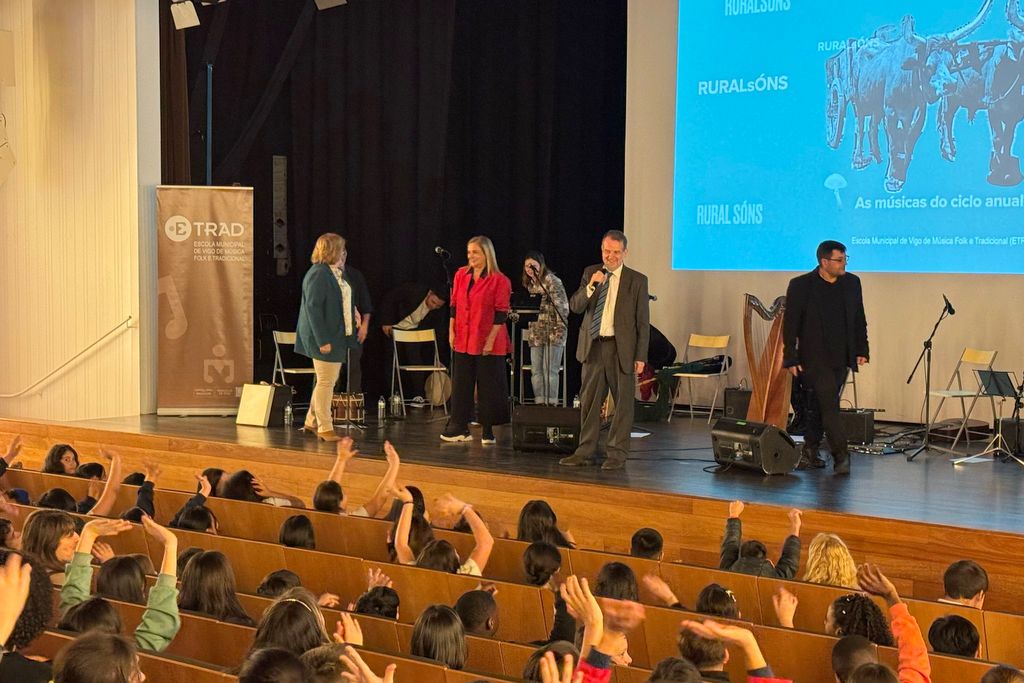 El alcalde saludó a los 275 estudiantes que asistieron al concierto didáctico organizado por la Escuela Municipal de Música Folk y Tradicional (E-TRAD) en el Auditorio Municipal. El Concello organiza durante esta semana un ciclo de conciertos para alumnos y alumnas de 5º y 6º de Educación Primaria de diferentes colegios de la ciudad y dar a conocer así la cultura musical e instrumental gallega, así como la labor que hacen en esta escuela municipal. “Disfrutad de la música y aprended del profesorado de la E-TRAD, que son magníficos”, dijo el regidor.