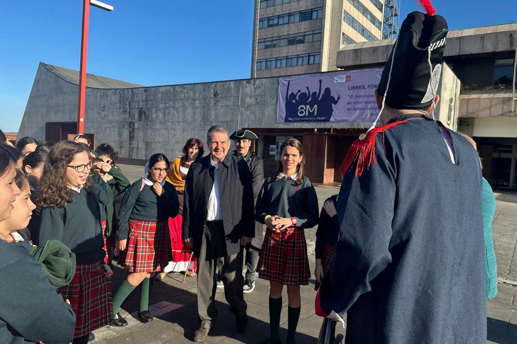 El alcalde recibió este lunes a las 47 alumnas del Colegio As Acacias que participan en la visita didáctica del programa municipal “Aventura no Vigo Vello-Reconquista 2025”, animándoles a interesarse por conocer la historia de la ciudad y específicamente por uno de los episodios de mayor trascendencia a consecuencia de que en 1809 la ciudadanía de Vigo lideró el inicio de la expulsión de España de las tropas napoleónicas. Hasta el próximo día 11 de abril cerca de 1.000 escolares recorrerán, con visitas teatralizadas, los puntos claves del casco histórico de Vigo donde tuvo lugar la Reconquista.