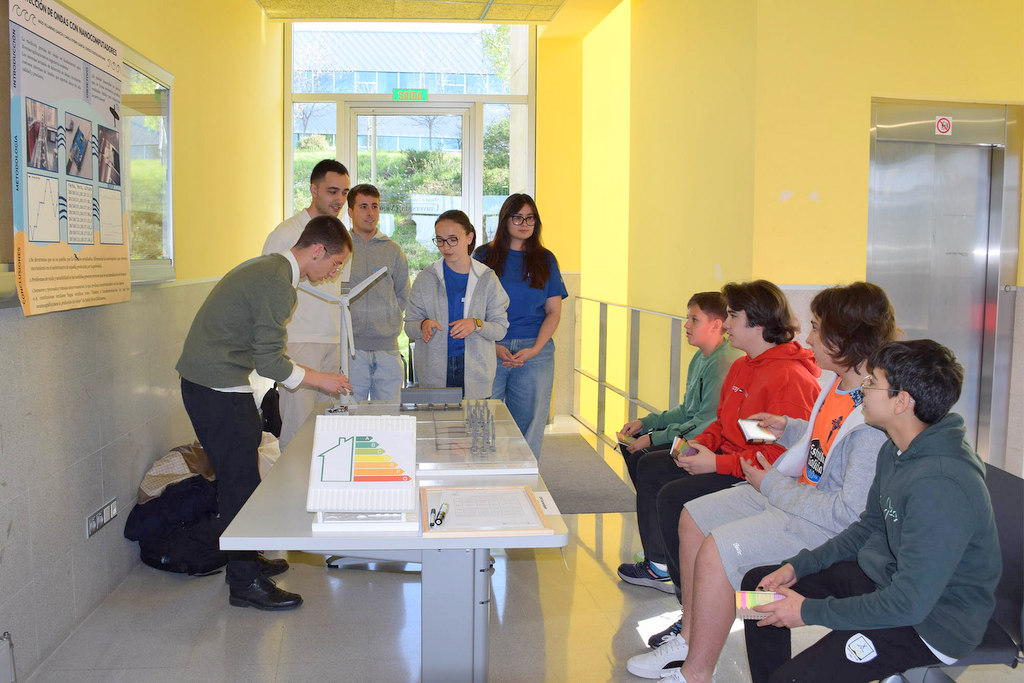 Una de las pruebas en las que participaron más equipos fue la de divulgación científica, en la que cada uno de los equipos tenía que explicar a un público no especializado -compañeros y compañeras de otros institutos- un concepto relacionado con el sector energético, para lo cual podían emplear todos los materiales y recursos desarrollados a lo ancho de los últimos meses en sus institutos. “En nuestro caso lo que hicimos fue montar un prototipo de aerogenerador, mucho más simple que uno real, evidentemente, pero muy ilustrativo”, explicaba momentos antes de arrancar la presentación un alumno del IES Lagoa de Antela, de Xinzo da Limia, dispuesto a convencer al jurado de las bondades de este trabajo.