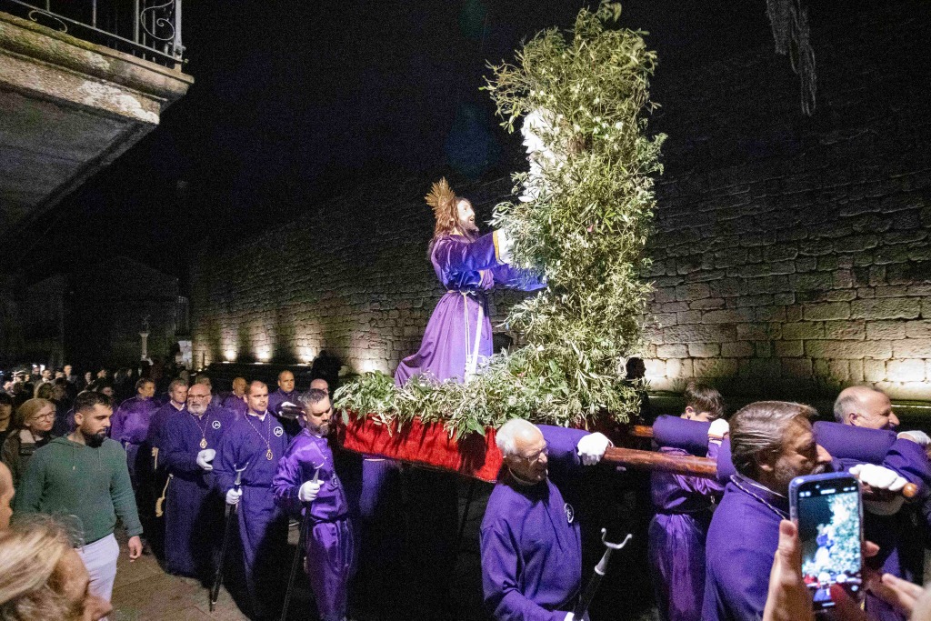 Sobre un anda rodeada de laurel y olivo, dieciséis hombros portaron al Jesús Nazareno, que oraba en Getsemaní ante la imagen de un ángel. Durante el recorrido por el conjunto histórico de la ciudad tudense, que contó también con la participación de la Banda de Música de Tui, los miembros de la Hermandad se tornaron para portar la imagen. Numerosos fieles acompañaron al Nazareno y, desde los balcones, se realizaron ofrendas florales.