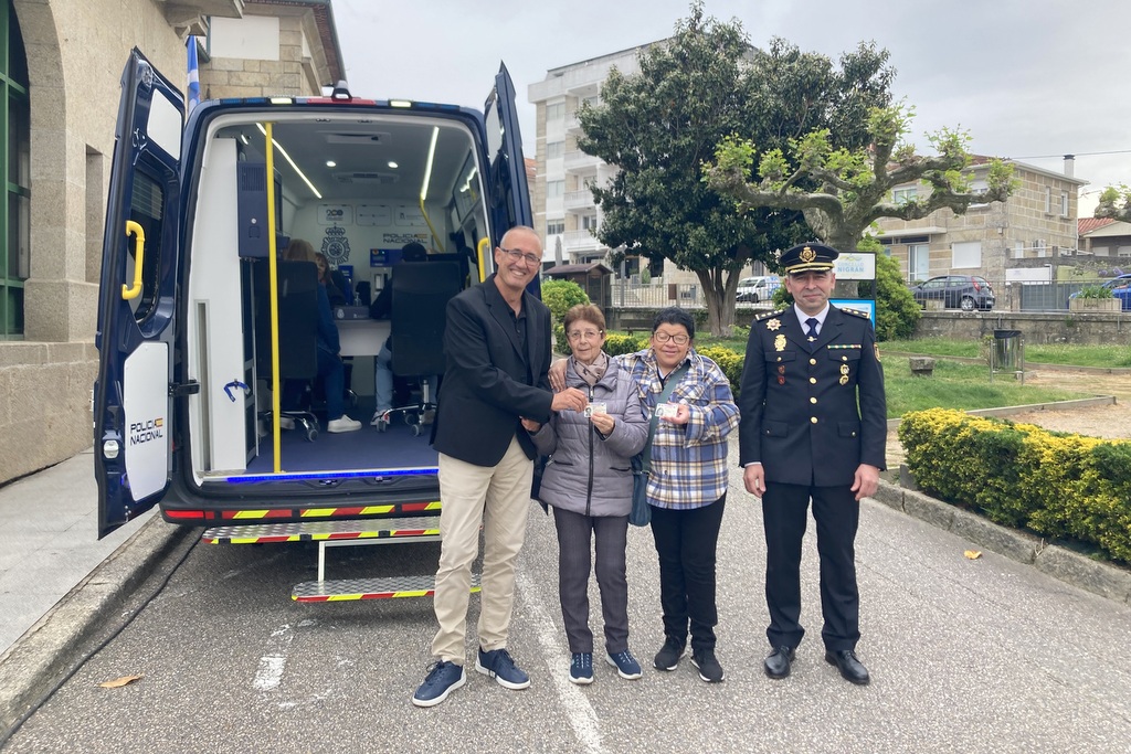 El Concello de Nigrán estrenó este viernes la unidad móvil de la Policía Nacional que expide DNI y Pasaporte en solo 10 minutos con María Ronco y su hija Puri como primeras usuarias. Ambas marcharon para casa con el DNI renovado en la mano. El alcalde de Nigrán, Juan González, acudió a este estreno junto al jefe de Coordinación Operativa Local de la Comisaría de Vigo-Redondela, Luis Hombreiro, y la Secretaria General de dicha comisaría, Esther Arén, acompañados también del edil de Seguridad, Rubén Rial; y Teodoro de la Peña, quien asumió recientemente el cargo de jefe de la Policía Local de Nigrán.