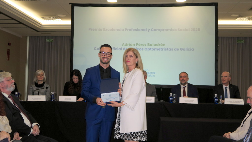 El óptico optometrista vigués Adrián Pérez Baladrón, colegiado del Colexio Oficial de Ópticos Optometristas de Galicia, ha sido premiado con el ‘Premio a la Excelencia y Compromiso Profesional 2025’ de la Unión Profesional de Galicia. Los galardones se entregaron el pasado sábado en un acto celebrado en Santiago al que asistió la presidenta de la entidad Esther Amaro; el tesorero Alexander Dubra; y el vocal de Formación y Cultura del Colexio, Carlos García Resúa.