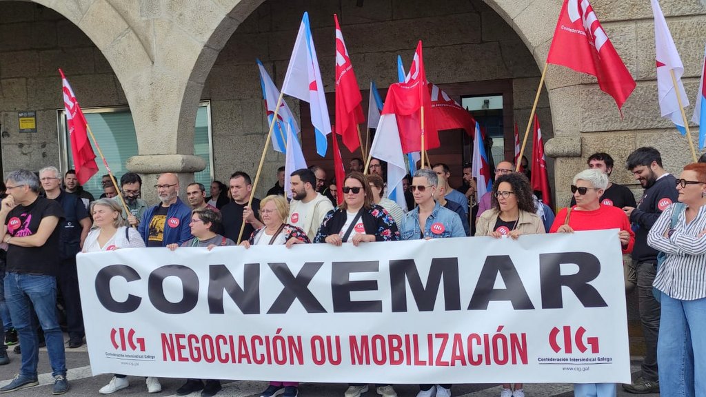 La CIG optó por llevar a cabo la concentración de esta mañana tras la decisión unilateral del empresariado de anular la reunión de la mesa negociadora prevista para hoy “con el agravante de no fijar una fecha alternativa”. Una decisión que la patronal basa en el acuerdo del Consejo de Ministros de tramitar por la vía de urgencia la reducción de la jornada. “En consecuencia, se niega a negociar el convenio mientras no se publique el Decreto que recoge la reducción de jornada”.