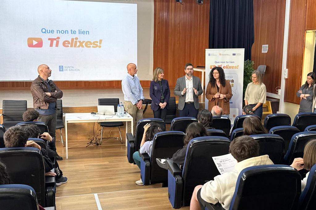 El secretario xeral de Emprego e Relacións Laborais, Pablo Fernández, junto con la directora xeral de Promoción da Igualdade, María Quintiana, participaron esta mañana en una nueva jornada del programa “Que non te líen, ti elixes” en el IES Val do Tela, ubicado en el municipio de Ponteareas y donde también estuvo la alcaldesa de este ayuntamiento, Nava Castro. En esta ocasión, el alumnado del 4º curso de la Educación Secundaria Obligatoria (ESO) recibió la visita de representantes de la Federación Empresarial de Aserradores y Rematantes de Maderas de Galicia (Fearmaga) y del sector forestal, que pusieron en valor el papel de mujeres de éxito profesional en este ámbito como fuente de inspiración para estimular el espíritu crítico en la identificación de estereotipos sexistas asociados a este campo, tradicionalmente masculinizado.