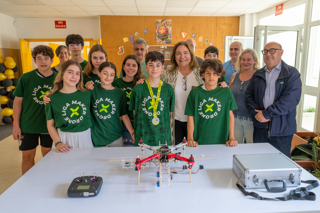 Los representantes autonómicos mantuvieron un encuentro con los alumnos que lograron el premio a la destreza en vuelo en el certamen celebrado el pasado mes de mayo. Mateo, Amaya, Kira, Ildara, Paula, Carlota, André, Sergio y Andrés, así como la coordinadora, Almudena Rouco, explicaron su proyecto para diseñar, programar y volar un sistema sobre un dron para el transporte inmediato de medicinas a medios rurales o de difícil acceso. En la misma Liga Maker Dron el ganador absoluto fue otro equipo de la ciudad de Vigo, el del CPR Montecastelo.