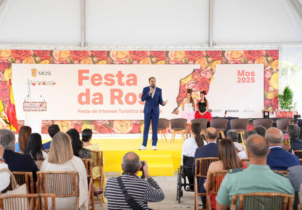 El acto institucional, celebrado en el Pazo de Mos, estuvo presidido por la alcaldesa, Nidia Arévalo, quien subrayó en su discurso que “la Rosa huele allí donde va, muestra toda su hermosura y es nuestro símbolo. Está en nuestro escudo, en nuestra bandera y en nuestros corazones”. Arévalo expresó su orgullo por la evolución de la fiesta, que cada año crece en programación y relevancia, uniendo las parroquias de Mos alrededor de un símbolo común. En la parte institucional también intervinieron Luis López, presidente de la Diputación de Pontevedra, y María José Gómez Rodríguez, conselleira de Medio Rural.