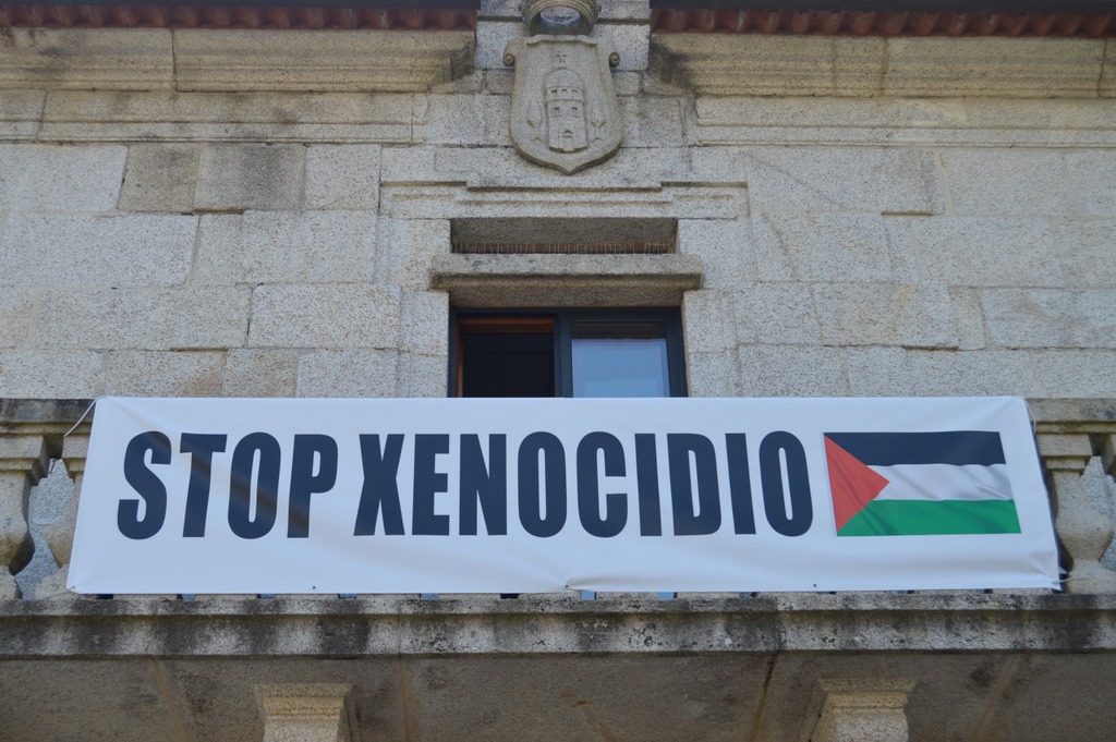 Desde hace unos días, una lona colgada en el balcón del Concello recuerda cada día este compromiso con el pueblo de Palestina, con la vida y con la libertad.