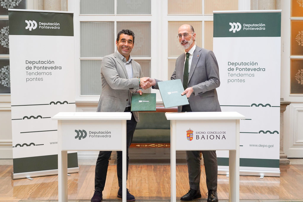 El presidente de la Diputación de Pontevedra, Luis López, viene de firmar el convenio de colaboración con el alcalde de Baiona, Jesús Vázquez Almuíña, para la financiación del proyecto de reurbanización de la Plaza de Santa Liberata. Un acuerdo firmado en el marco del Plan Extra, el novedoso plan de inversiones del gobierno provincial que moviliza hasta 38 millones de euros entre los ayuntamientos de menos de 50.000 habitantes de la provincia para ejecutar proyectos estratégicos. En el Pazo provincial, López y Vázquez Almuíña sellaron un acuerdo a través del cual la Diputación financia el 100% del presupuesto, de casi 1,4M€; con una aportación de 900.000€ al amparo de este Plan Extra y otra de 493.570€ para cubrir la parte correspondiente al Concello con recursos del Plan +Provincia.