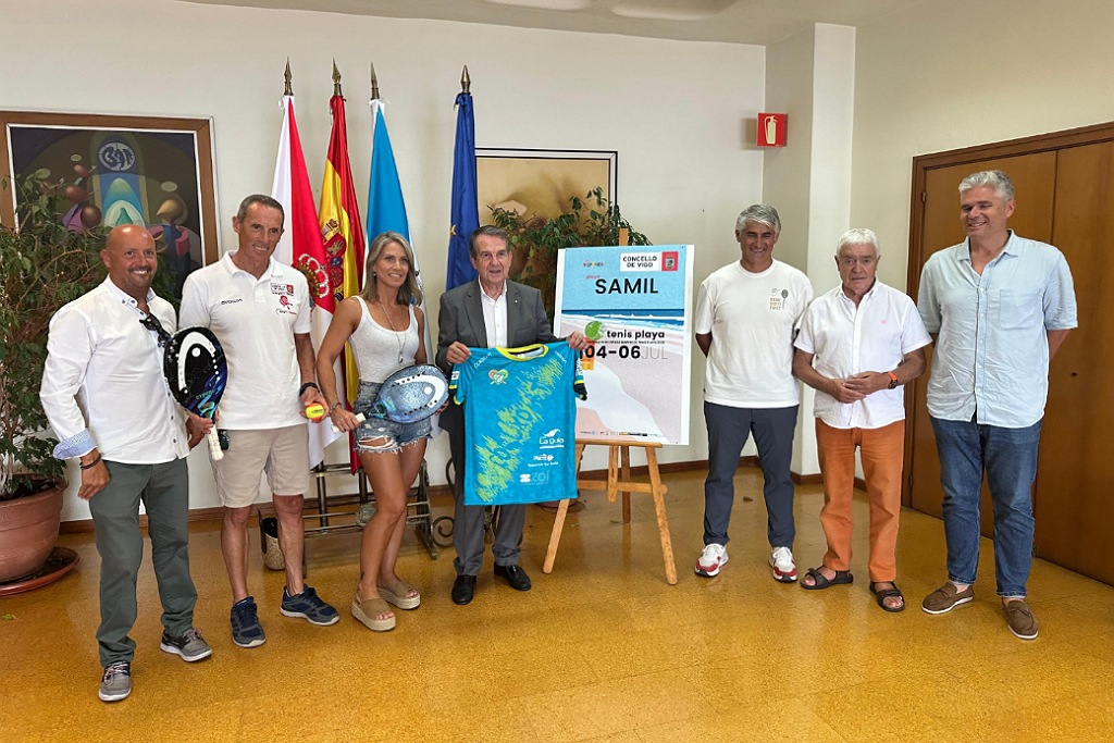 Este viernes 4 de julio comienza la 6ª Liga Mapfre de Tenis Playa Gran Premio Concello de Vigo. El alcalde, Abel Caballero, recibió esta mañana a la organización del torneo, que se disputará en la pista Vigoarena de Samil hasta el domingo 6 de julio. Vigo es la única sede en Galicia de la liga, que comenzó en 2020 y que este año cuenta con 14 pruebas y que reunirá a 120 participantes, entre los que se encuentran las mejores raquetas de la disciplina en España.