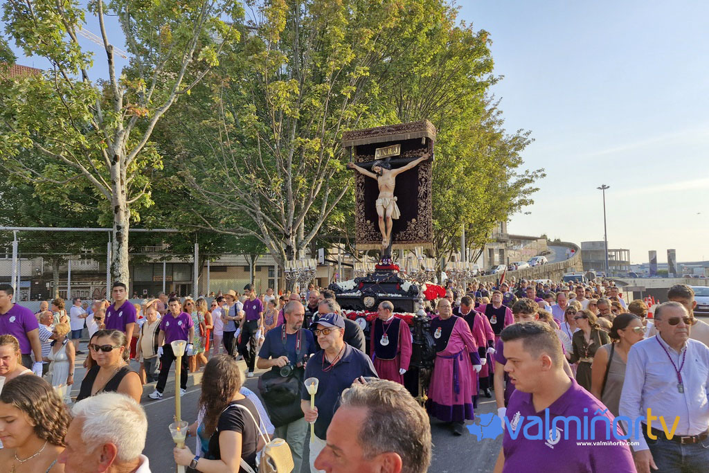 Entre ovaciones y acompañado por miembros de la Brilat, el Cristo se adentró en Praza da Igrexa para iniciar su recorrido por las calles de la ciudad olívica, abandonando, temporalmente, los muros de su hogar en la concatedral-basílica de Santa María. En esta ocasión, el periodista de Faro de Vigo, Fernando Franco, acompañado de su familia, portó el estandarte de la cofradía del Santísimo Cristo. Al paso de ofrendas florales lanzadas por devotos que se asomaban a los balcones al paso del Cristo, la procesión se encaminó por la calle Real, O Berbés, Cánovas del Castillo, Montero Ríos, Concepción Arenal, Colón, Príncipe y la peatonalizada Porta do Sol, antes de despedirse de regreso a Praza da Igrexa.