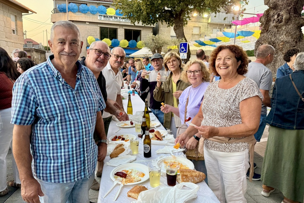 En el plano gastronómico, la fiesta puso en valor lo mejor del entorno: chorizos artesanos de Embutidos Torroña (Oia), pan de la Panadería La Miñorana (Nigrán – A Ramallosa), huevos de Granjas El Rancho de Mañufe (Gondomar), vino Rectoral de Peitieiros (Gondomar) y aceite de oliva virgen extra de Aceites Abril (Ourense). Un producto 100% gallego, elaborado con mucho cariño por más de treinta personas voluntarias que sirvieron alrededor de 1.500 raciones.