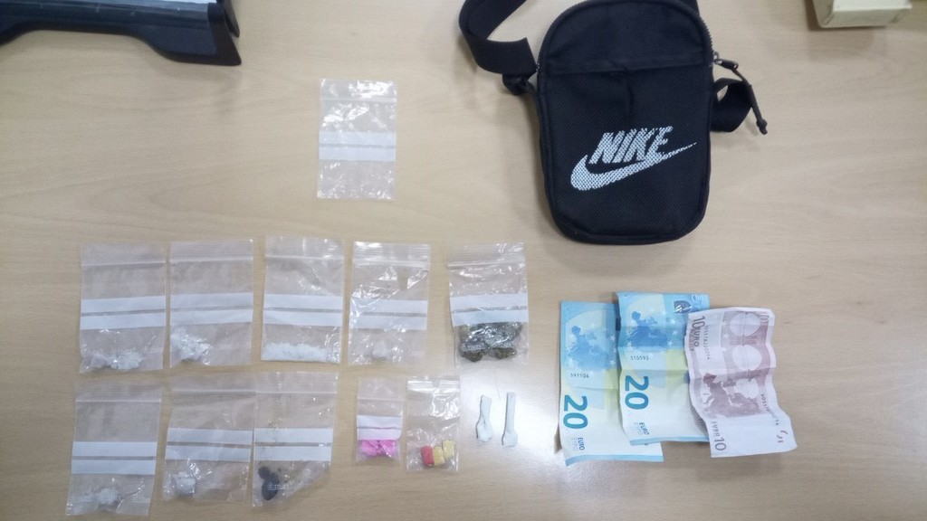 A mayores, en la bandolera también se le encontraron 50 euros, cantidad fraccionada en dos billetes de 20 y uno de 10 euros. Fue detenido por la supuesta comisión de un delito contra la salud pública.
