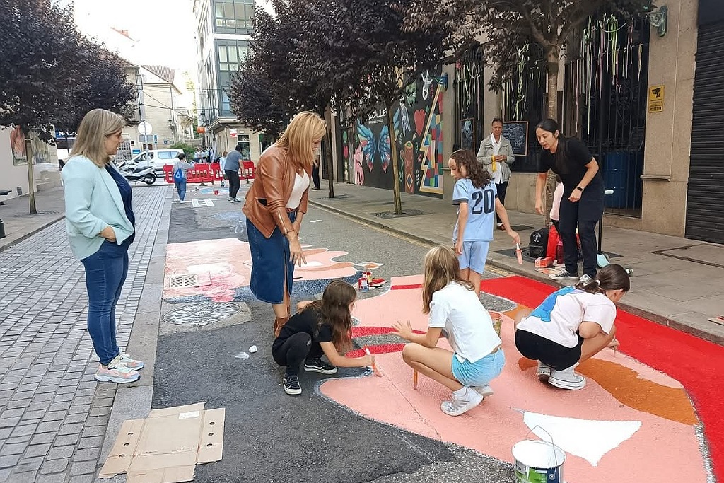 Alfombristas, jóvenes y voluntarios de todas las edades están participando en la elaboración de un gran mural en la superficie de la calle peatonal Padre Sarmiento. El Concello de Redondela puso en marcha esta iniciativa para dar una nueva vida a esta calle y rendir homenaje a las tradiciones del municipio. Los viaductos, las alfombras florales, la Coca y los gigantes son algunos de los protagonistas de esta creación, que fue encargada a la artista local Paula Amoedo.