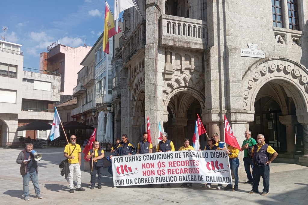 El personal de la Unidad de Reparto de Correos en O Porriño se movilizó este mediodía delante del Concello para denunciar la sobrecarga de trabajo que padece tras la reestructuración de la oficina con la eliminación de tres plazas, lo que está provocando acumulación de millares de envíos y de notificaciones sin entregar.