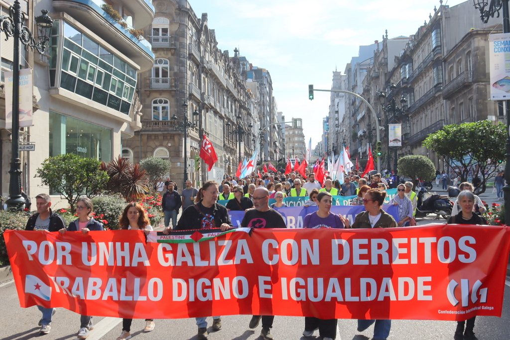 Ya en lo que tiene que ver con la campaña puesta en marcha hoy bajo lema “Por unha Galiza con dereitos, traballo digno e igualdade”, el secretario general de la CIG, Paulo Carril, que participó en la asamblea de Vigo y en la manifestación posterior por las calles de la ciudad, hizo hincapié en que la gravedad de la situación económica actual y de pérdida de derechos laborales es consecuencia de las políticas “letales” para la sociedad gallega que el Gobierno del PP en la Xunta está aplicando, “poniendo todo lo público a disposición del negocio y de la rentabilidad del capital y de los fondos de inversión, imponiendo un modelo de turismo desordenado y descontrolado y la eucaliptización del país, mientras agonizan importantes sectores productivos y se ahonda en un modelo que consolida la histórica generación de graves desequilibrios territoriales, sociales y ambientales”.