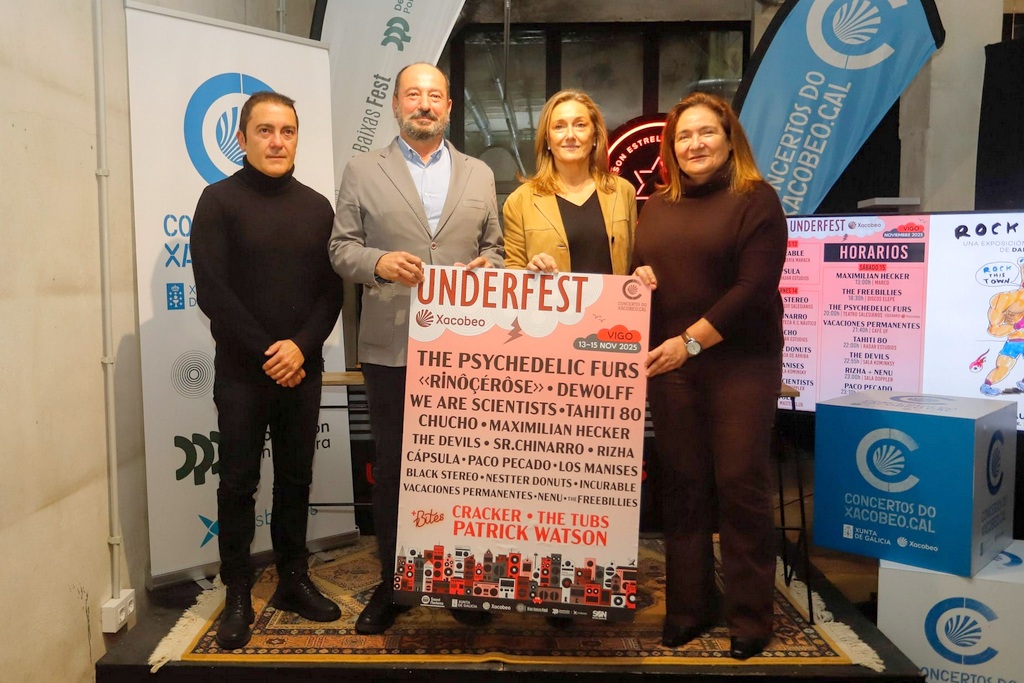 Este miércoles ha tenido lugar en Vigo la presentación del festival Underfest Xacobeo 2025, que ha contado con la presencia del director de Turismo de Galicia, Xosé Merelles, la delegada territorial de la Xunta de Galicia en Vigo, Ana Ortiz, la vicepresidenta segunda de la Diputación de Pontevedra, Luisa Martínez, y el director de Sweet Nocturna, David Lago (Tibe), empresa promotora del festival.