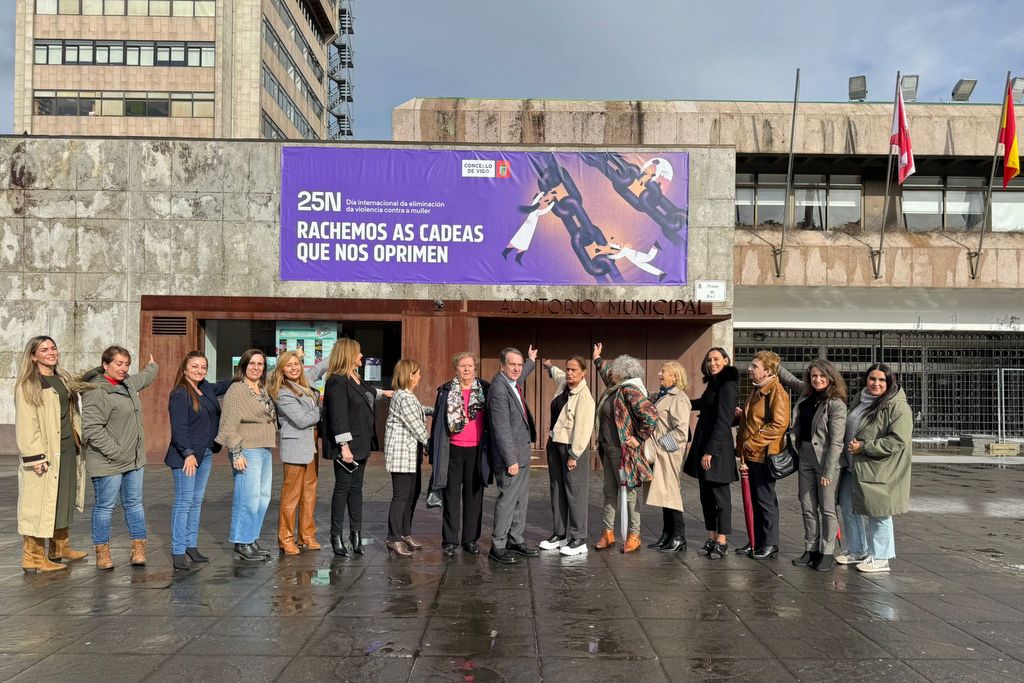 La fachada principal del Concello de Vigo muestra desde hoy la pancarta gigante con el mensaje central del Día Internacional para la Eliminación de la Violencia contra las Mujeres: “Rompamos las cadenas que nos oprimen”. El despliegue de la lona contó con la presencia del alcalde y de las concejalas del Gobierno de Vigo, así como de las componentes del Consejo Municipal de la Mujer. Durante el mes de noviembre el Concello desarrolla un extenso programa de actividades culturales y de reflexión, que concluirán el día 28 de noviembre.
