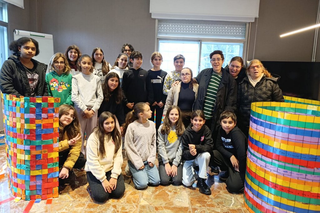 A lo largo de tres jornadas previas, las niñas y niños de los cinco colegios de Mos -CEIP Mestre Martínez Alonso, CEIP Mestre Valverde Mayo, CEIP Pena de Francia, CEIP Atín y CEIP Petelos- participaron en la creación de una obra artística colectiva realizada sobre una malla metálica de diez metros. La actividad consistía en tejer cintas de colores formando patrones geométricos y añadir mensajes positivos relacionados con la inclusión, la diversidad y el respeto.