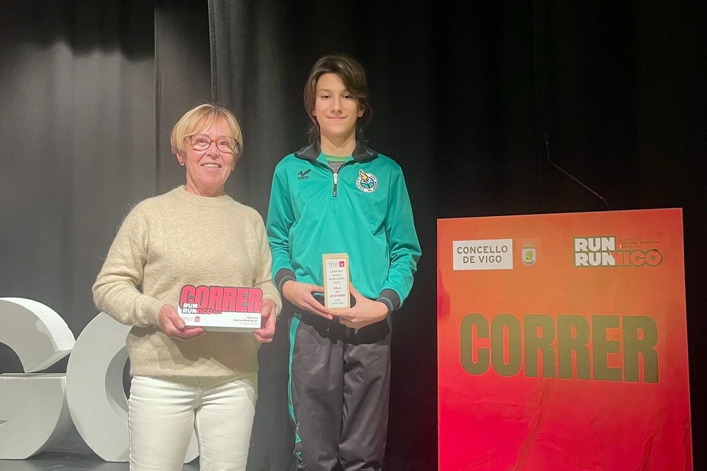 Carmen Costas recibía el premio como ganadora de la categoría F.5 del circuito RunRunVigo 2025, después de haber tomado parte en las 12 pruebas que componen este circuito urbano de carreras en el Concello de Vigo a lo largo de los meses del año, entre enero y noviembre. Recibiendo también otra distinción por sus 12 participaciones en las 12 pruebas del circuito. Atleta incansable a sus 68 años, que disfruta del deporte y concretamente del atletismo como si de una veinteañera se tratara, y a la que podemos ver cualquier día recorriendo kilómetros por Gondomar, Nigrán o cualquier otro lugar del Val Miñor.